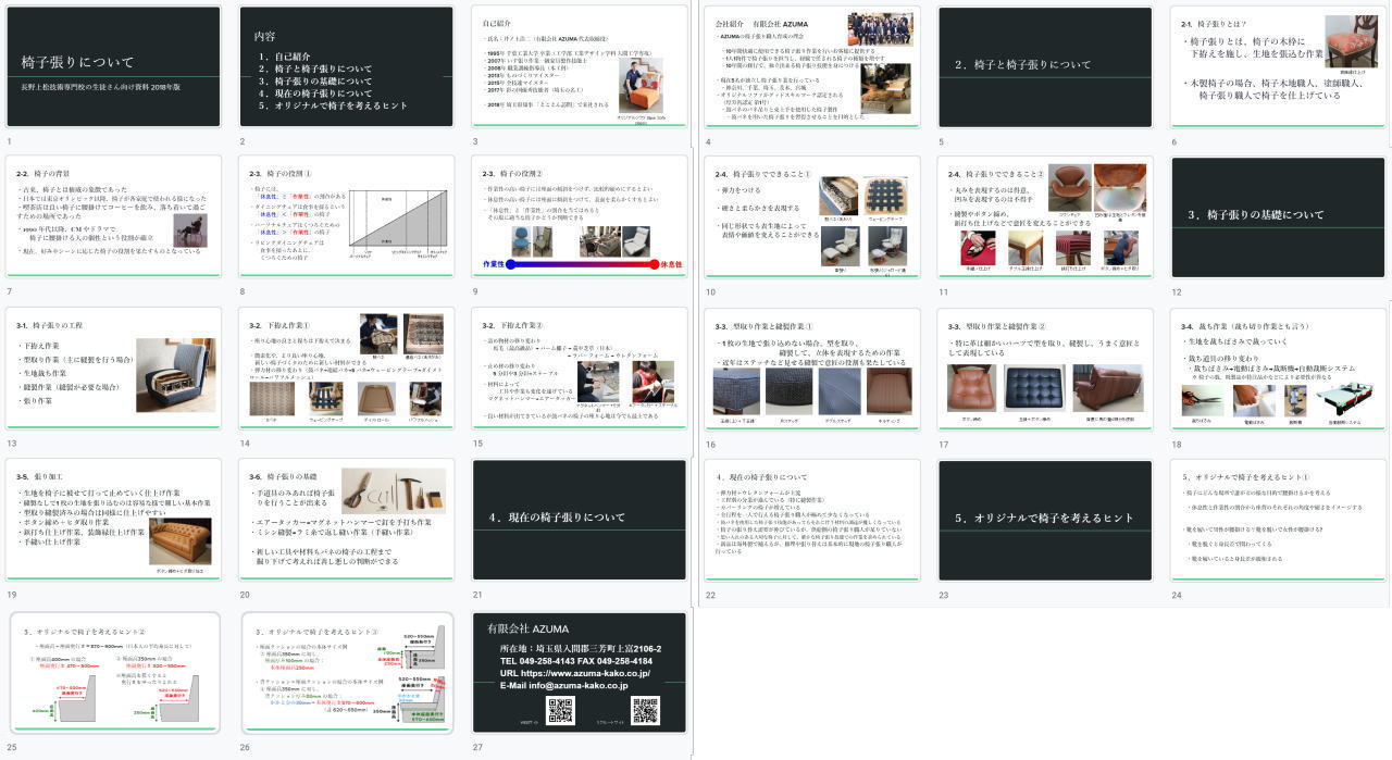 今回の椅子張りの説明会用に私が用意した資料の内容は以下の通りです。