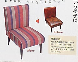 今回、リフォームをお願いした「東加工所」は、”椅子張り職人”が難しい要望にも応えてくれる、椅子張りのプロ集団。布の持ち込みも可能だ。布地選びの ポイントは適度な厚さがあること。ただし、厚ければ何でもOKではない。カーテン生地などは2年ほどでダメになってしまうのだとか。